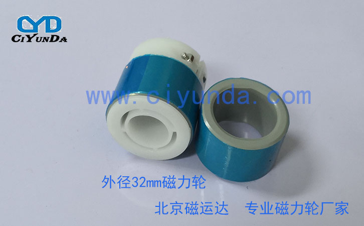 外徑32的粘接磁力輪,目前我們有塑料支架和鋁支加的。內孔20mm、15mm、12mm、10mm等,磁極為8級,對應型號為CM3208P等