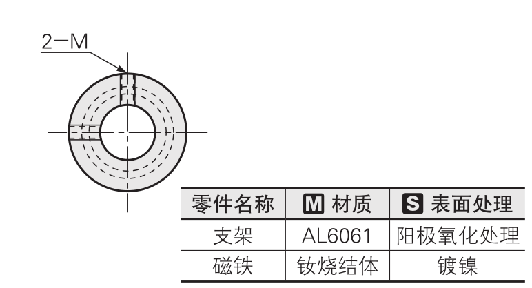 | 系列 | 外徑D | 磁極數P | 內徑d | 支架材質 | 表面處理 | 固定方式 | 間隙1mm時扭矩,N.m | L | l | N | M | 使用溫度 |